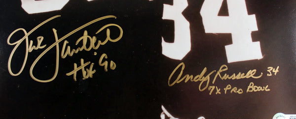 This Autographed 16x20 Photo with the inscription of "HOF 90 (Lambert), HOF 88 (Ham) & 7x Pro Bowl (Russell)" has been Personally Signed by Jack Lambert, Jack Ham & Andy Russell of the Pittsburgh Steelers. This item is 100% Authentic to include a hologram by Beckett Authentication Services. This item will come with the new Beckett Authentication hologram that has a scannable QR code rather than the traditional COA. If you would like to have a COA, you are welcome to reach out to Beckett for a printed certification once you receive your item. This is a BAS Witnessed Protection Program item which means a Beckett Authentication Service representative was present when this item was being signed. We conducted an autograph signing with Jack Lambert, Jack Ham & Andy Russell where multiples of the same item were signed. While the photographs are representative of this item, the size, placement and strength of the signature may vary. Each item is hand signed, therefore, each autograph is unique. This item can be verified through BAS Witnessed.