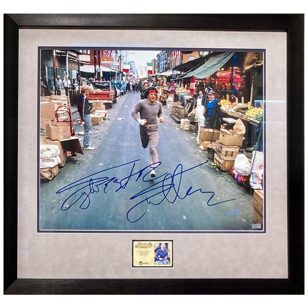 This iconic 16x20 photo (approximately 27" x 22.5" framed) from Rocky has been personally hand-signed by Rocky Balboa himself, Sylvester Stallone during his signing with Celebrity Authentics. Rocky Balboa (Sylvester Stallone), a small-time boxer from working-class Philadelphia, is arbitrarily chosen to take on the reigning world heavyweight champion, Apollo Creed (Carl Weathers), when the undefeated fighter's scheduled opponent is injured. While training with feisty former bantamweight contender Mickey Goldmill (Burgess Meredith), Rocky tentatively begins a relationship with Adrian (Talia Shire), the wallflower sister of his meat-packer pal Paulie (Burt Young). Ships affixed with the Celebrity Authentics serial-numbered and tamper evident Authentication Hologram and includes Celebrity Authentics Certificate of Authenticity featuring a picture of Sylvester signing photo. Framing: Photo is meticulously dry mounted and framed using acid free backing and mat boards with white core for the finest in presentation. UV protective glass with precision cut moulding are used for smooth, clean frame edges, hand assembled in our studio. Additionally, a protective back cover is used to seal the piece with corner bumpers applied to protect your walls, providing adequate air flow. A hanger is affixed to complete the finished collectible. Each framed photo is carefully wrapped for shipping with double protective corners and cushioning to help ensure the item's safe arrival. Celebrity Authentics Framing Studios - acclaimed as the industry's finest!Please note: with multiples signed by the actor, a sample photo is used from stock to represent what you will receive. Exact autograph size and placement may vary.