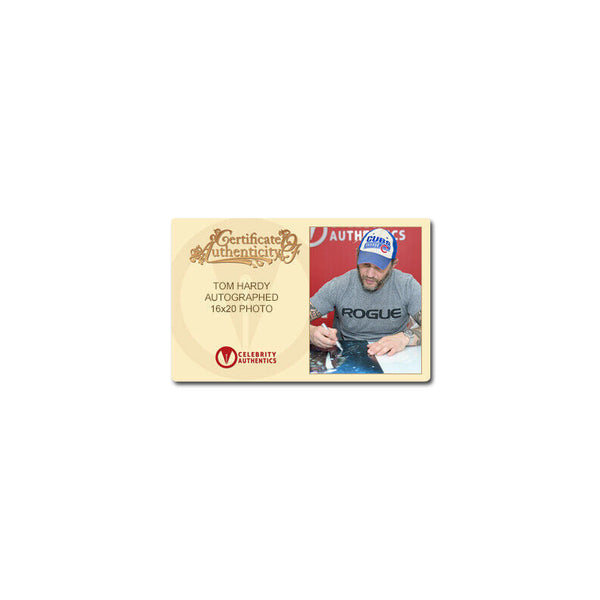 Celebrity Authentics is the exclusive autograph partner of Tom Hardy. Please be aware most other online autographs purported to be Mr. Hardy's are forgeries. Mr. Hardy has only signed with Celebrity Authentics so be sure the item you choose is affixed with the Celebrity Authentics Authentication Hologram for his genuine signature.This 2012 The Dark Knight Rises Bane 16x20 Photo featuring Tom Hardy as Bane atop the Camouflage Batmobile Tumbler has been personally autographed by Tom during his signing with Celebrity Authentics. It has been eight years since Batman (Christian Bale), in collusion with Commissioner Gordon (Gary Oldman), vanished into the night. Assuming responsibility for the death of Harvey Dent, Batman sacrificed everything for what he and Gordon hoped would be the greater good. However, the arrival of a cunning cat burglar (Anne Hathaway) and a merciless terrorist named Bane (Tom Hardy) force Batman out of exile and into a battle he may not be able to win. Acclaimed as one of the finest Batman films ever made, photo ships affixed with Celebrity Authentics serial-numbered Authentication hologram and includes Celebrity Authentics Certificate of Authenticity featuring picture of Tom signing photo.Please note: with multiples signed by the actor, a sample photo is used from stock to represent what you will receive. Exact autograph size and placement may vary.