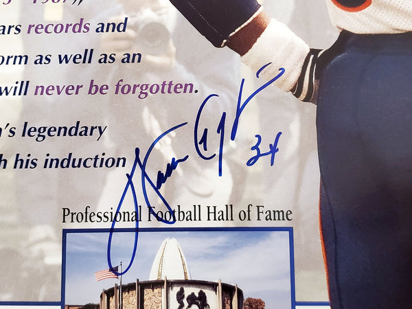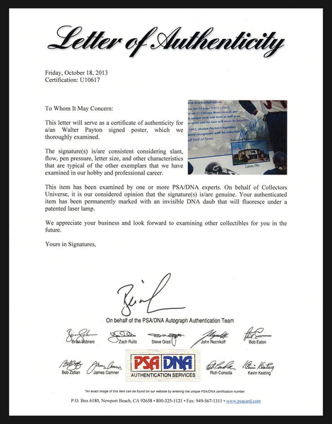 This is a 16x20 Poster Photo that has been hand signed by Walter Payton. It has been certified authentic by PSA/DNA and comes with their sticker and matching certificate of authenticity. This is on poster stock, and has some minor bends or creases throughout it, but still displays nice.