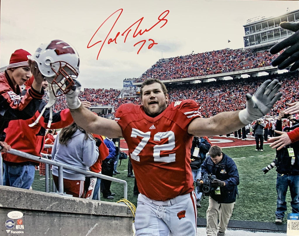 A 16x20 hand signed color photo of Wisconsin Badgers lineman JOE THOMAS. The signature is in Red Paint Pen This would make a great addition to any Browns or Badgers collection.This photo was signed at a public signing with us. This item is guaranteed to be 100% authentic and will include a COA from JSA authentication.