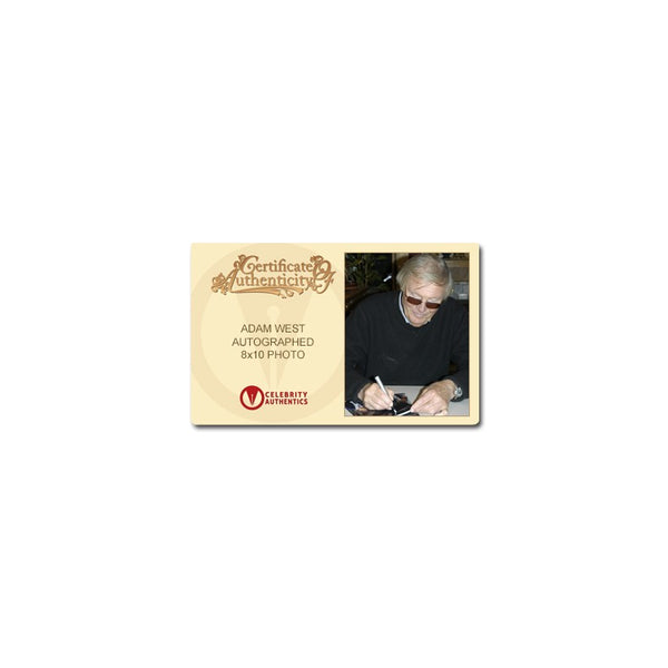 This 8x10 photo from the classic Batman 1960's series has been personally hand-signed by the legendary Caped Crusader himself, the late Adam West during his signing with Celebrity Authentics. Adam West is synonymous with 'Batman', defining the Caped Crusader in the popular 1960's television series and 1966 film. Kaaapowie! Holy feature film, Batman ... one based on the tongue-in-cheek, campy 1960's television series. Watch Batman (Adam West) and Robin (Burt Ward) battle sharks, Catwoman, The Joker and The Riddler on the big screen. Can they try to prevent the bad guys from taking over the world? With a wham! and a pow! and a zip! ... our heroes just might win. Ships affixed with Celebrity Authentics serial-numbered and tamper evident Authentication Hologram and includes Celebrity Authentics Certificate of Authenticity with picture of Adam signing. Please note: with multiples signed by the actor, a sample photo is used from stock to represent what you will receive. Exact autograph size and placement may vary.