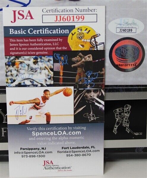 This autographed 8x10 photo, displayed in a plaque measuring 11" x 13" has been personally hand-signed by Bobby Hull of the Chicago Blackhawks. This autograph is certified by James Spence Authentication (JSA). It comes with the numbered hologram and matching Certificate of Authenticity. The photo is in a top-loader and affixed to the plaque so the photo can easily be removed.