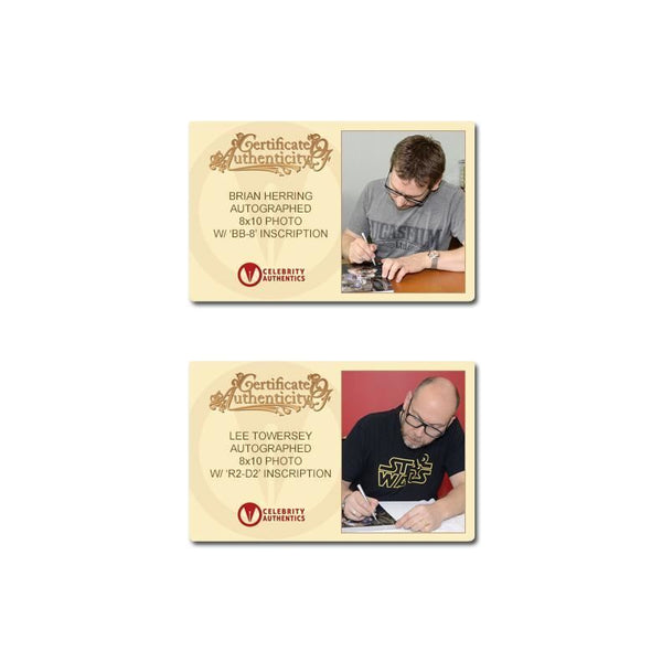 This 8x10 photo of BB-8 and R2D2 from Star Wars: The Force Awakens has been personally hand-signed by the master craftsmen who brought them to life, Brian Herring and Lee Towersey during their signings with Celebrity Authentics. As a new threat to the galaxy rises, Rey, a desert scavenger, and Finn, an ex-stormtrooper, must join Han Solo and Chewbacca to search for the one hope of restoring peace. Experience the motion picture event of a generation in Star Wars: The Force Awakens. Ships affixed with Celebrity Authentics serial-numbered and tamper evident Authentication Hologram and includes Celebrity Authentics Certificates of Authenticity featuring picture of Brian and Lee signing photo. Please note: with multiples signed by the actor, a sample photo is used from stock to represent what you will receive. Exact autograph size and placement may vary.