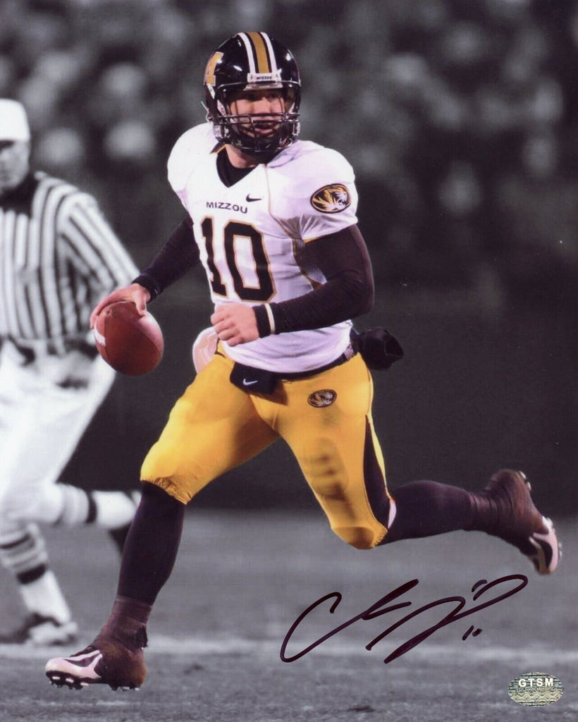 Chase Daniel, former All-American quarterback for the Missouri Tigers, has hand signed this 8x10 photo at a private signing. This item comes with a certificate of authenticity (COA) from GT Sports Marketing, one of the leaders in the industry. You will receive a paper COA along with an official GTSM hologram on the photo.Item pictured may not be the exact item you will receive. It will be similar quality, and we guarantee your satisfaction.