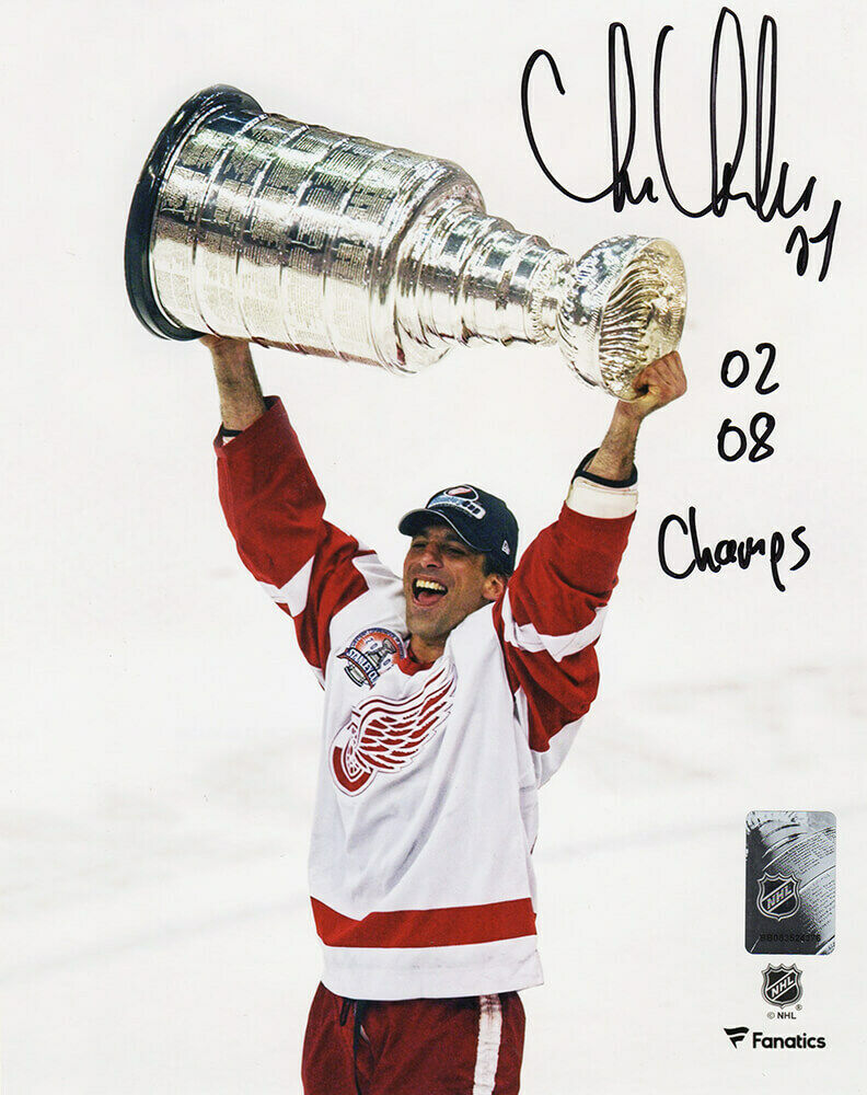 Chris Chelios signed Detroit Red Wings holding Stanley Cup 8x10 photo with '02, 08 Champs' inscription. Item comes with a Schwartz Sports Memorabilia tamper-proof numbered hologram and Certificate of Authenticity which can be verified online.