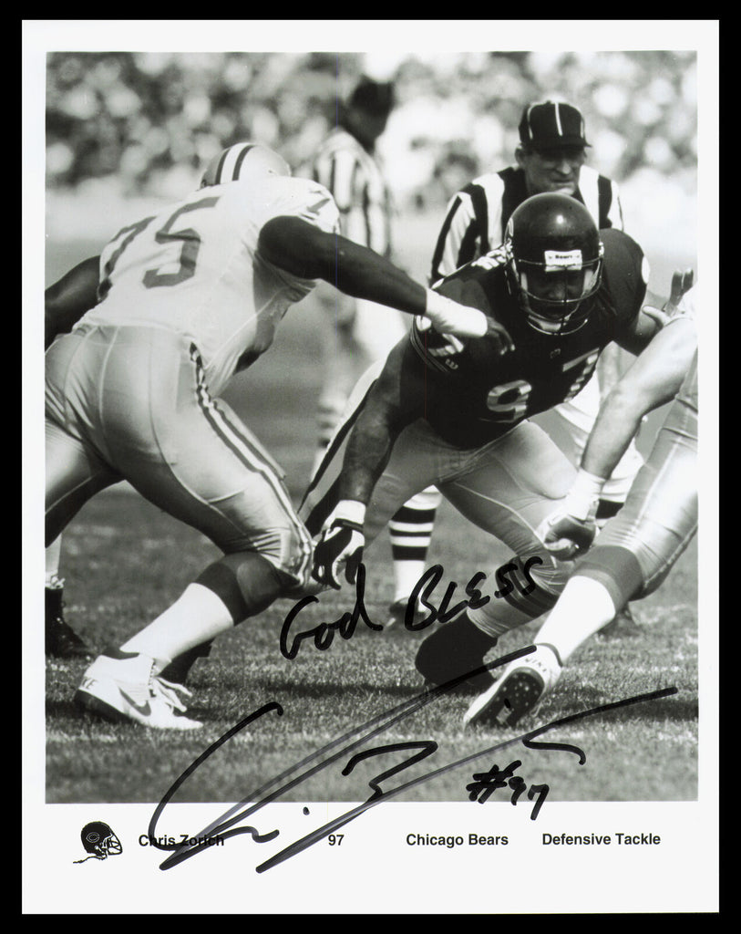This is an 8x10 Photo that has been hand signed by Chris Zorich. This item was inscribed "God Bless." This item is guaranteed to pass any third party authentication company including Beckett, PSA/DNA, & JSA authentication.