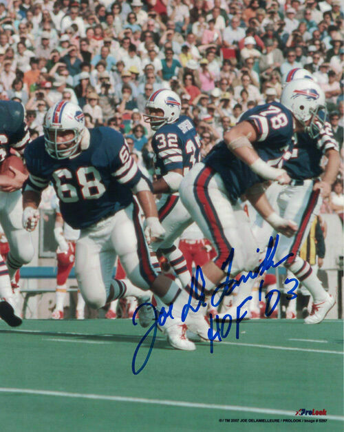 Joe Delamielleure Autographed/Signed Buffalo Bills 8x10 Photo 11032 This is a 8x10 photo that has been personally signed by Joe Delamielleure. He played 8 seasons (1973-1979, 1985) with the Bills and 5 seasons (1980-1984) with the Browns after earning All-American honors at Michigan State. During his career he was the leader of the "Electric Company" which blocked for OJ Simpson including his 2003 yard seson, he earned all-pro honors six times, was a member of the 1970's All-Decade team. He was elected into the Hall of Fame in 2003.This item includes a certificate of authenticity from Denver Autographs.