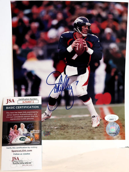 The product is an autographed 8x10 photograph of John Elway from the Denver Broncos. It has been signed by John Elway and comes with a certificate of authenticity from James Spence Authentication (JSA). This is an original autograph, making it a valuable piece for any football or sports memorabilia collector.