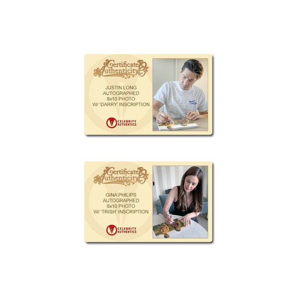 This 8x10 photo of Trish and Darry from Jeepers Creepers has been personally hand-signed by Gina Philips and Justin Long during their signings with Celebrity Authentics. After making a horrific discovery in the basement of an old abandoned church, Trish (Gina Philips) and her brother Darry (Justin Long) watch their routine road trip home from college turn into a heart-stopping race for their lives. They find themselves the chosen prey of an indestructible force that relentlessly pursues them and gives a new and chilling meaning to the old song "Jeepers Creepers." Ships affixed with Celebrity Authentics serial-numbered and tamper evident Authentication Hologram and includes Celebrity Authentics Certificates of Authenticity featuring picture of Gina and Justin signing photo. Please note: with multiples signed by the actor, a sample photo is used from stock to represent what you will receive. Exact autograph size and placement may vary.