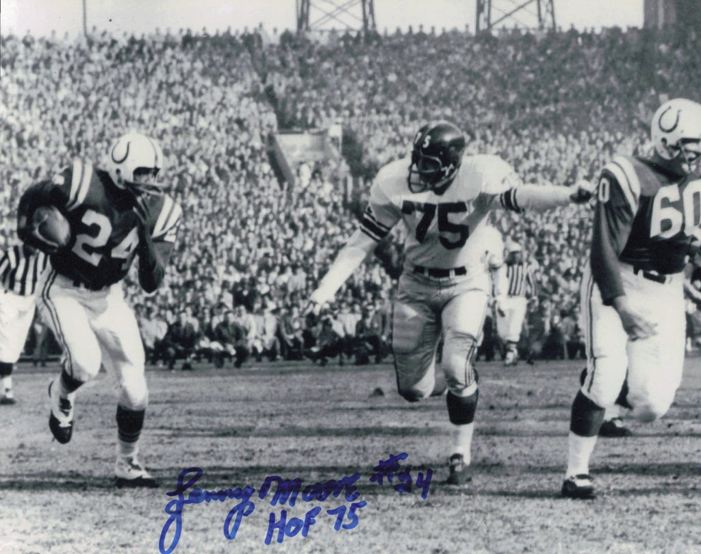 This is an 8x10 Photo that has been hand signed by Lenny Moore. This item was inscribed "HOF 75." This item is guaranteed to pass any third party authentication company including Beckett, PSA/DNA, & JSA authentication.