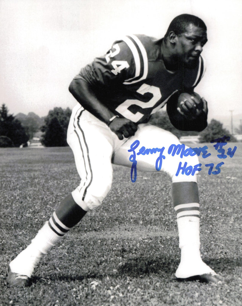 This is an 8x10 Photo that has been hand signed by Lenny Moore. This item was inscribed "HOF 75." This item is guaranteed to pass any third party authentication company including Beckett, PSA/DNA, & JSA authentication.
