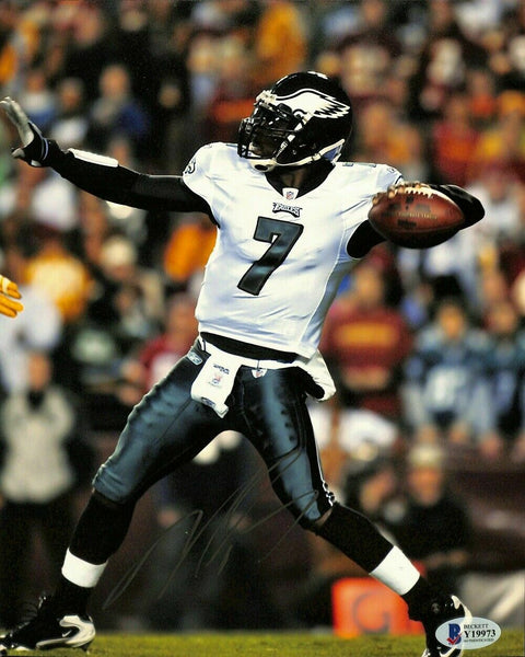 Featured is a Michael Vick signed Philadelphia Eagles 8x10 football photo. This photo was hand signed by Michael Vick and authenticated by Beckett authentication services. Included with the photo is a Beckett hologram and certificate of authentication... SPECIFICATIONS Autographed By: Michael Vick Team: Philadelphia Eagles Sport: Football Authentication: Beckett Grading Services