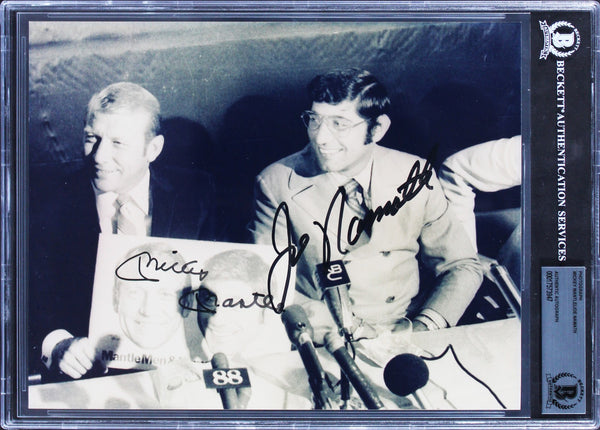 This Autographed 8x10 Photo has been Personally Signed by Mickey Mantle & Joe Namath. This item is 100% Authentic, it comes slabbed and authenticated by Beckett Authentication Services. The authenticity can be verified on Beckett Authentication Services website.