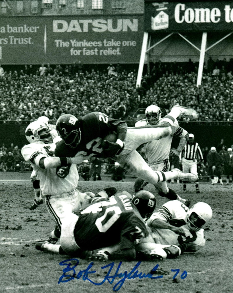 An 8x10 hand signed photo of former New York Giant great BOB HYLAND. The signature is in blue sharpie. HYLAND was a member of the New York Giants from 1971-75. This RARE unique color photo was signed at a public signing in our store in store. This would make a great addition to any Giants fan collection! This item is guaranteed to be 100% authentic and will include a store COA.