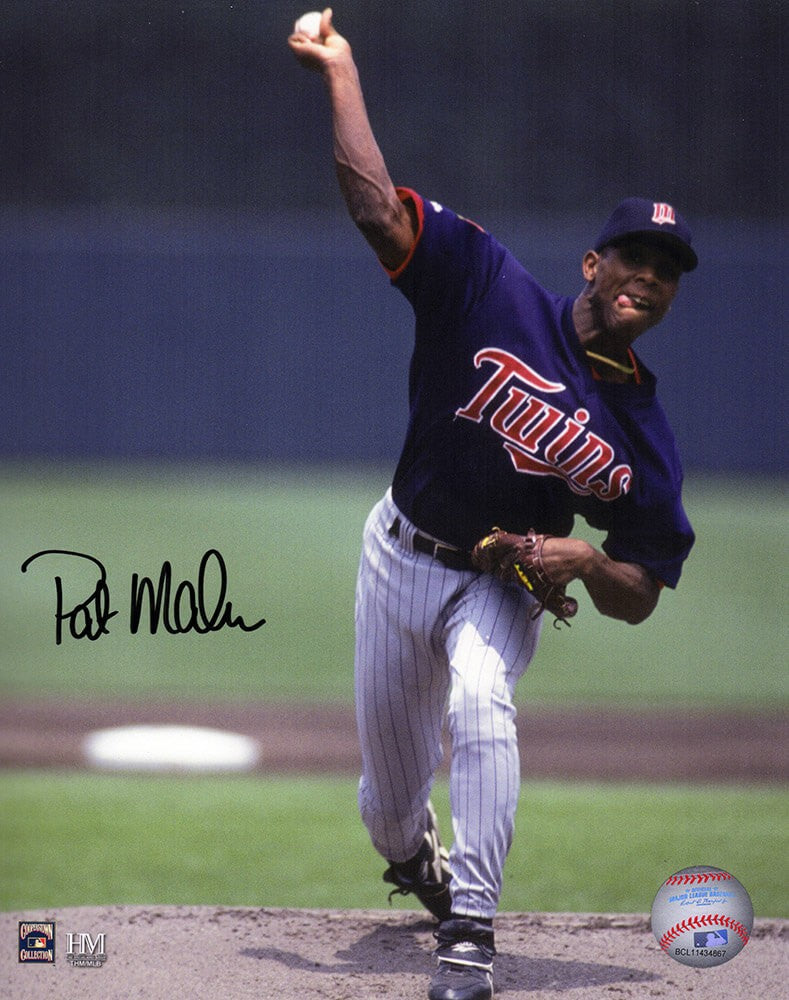 Pat Mahomes Sr. signed Minnesota Twins navy jersey pitching 8x10 photo. Item comes with a Schwartz Sports Memorabilia tamper-proof numbered hologram and Certificate of Authenticity which can be verified online.