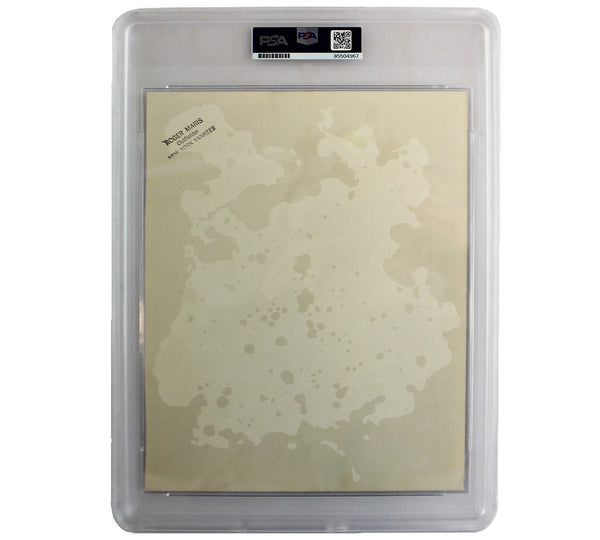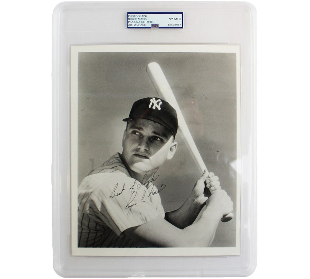 A New York Yankees 8x10 Grade 8 NM/MT Encapsulated Photo hand signed by Roger Maris. The item and signature are in excellent condition. In addtion to signing his name, Roger also inscribed "Best of Luck" on the Photo. AUTHENTICATION: The item is encapsulated in a tamper-evident case with a PSA databased serial number.