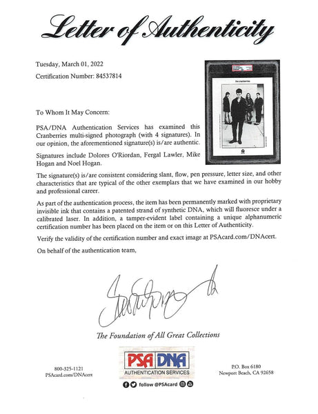 This Autographed 8x10 Promotional Photo has been Personally Signed by Dolores O'Riordan, Fergal Lawler, Mike Hogan & Noel Hogan of The Cranberries. This item is 100% Authentic, it comes slabbed and authenticated by PSA/DNA. The authenticity can be verified on Professional Sports Authenticator website.