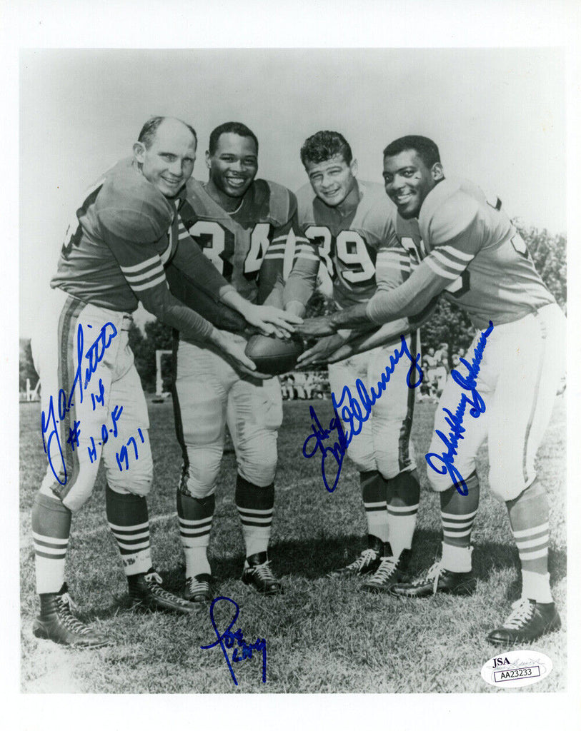 The number in the listing title is just an inventory sku for our records and is not the authentication number. This is the exact item that you will receive so please see picture for condition. This is an 8x10 photo that was personally autographed by Ya Tittle, Joe Perry, Hugh Mcelhenny and John Henry Johnson. Includes a certificate of authenticity from James Spence Authentication (JSA) and Denver Autographs.
