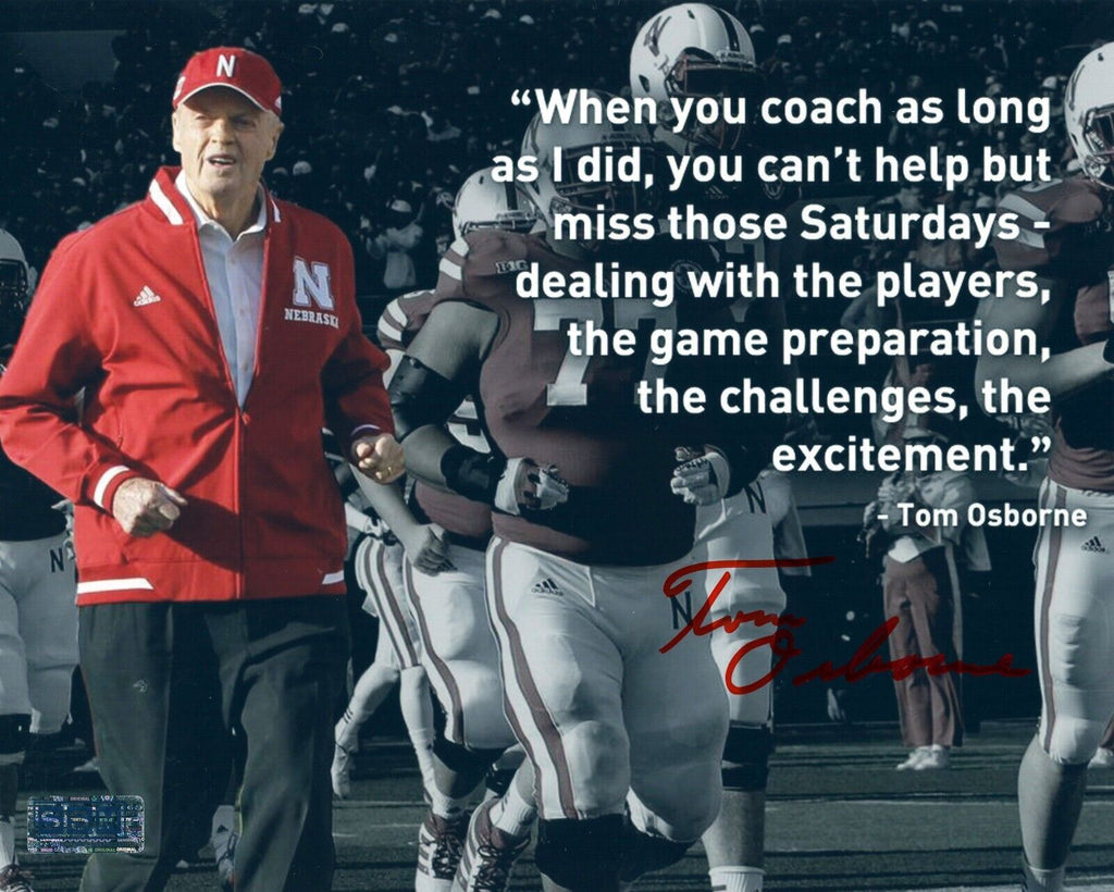 Tom Osborne, legendary head coach for the Nebraska Cornhuskers, has hand signed this 8x10 photo at a private signing. This item comes with a certificate of authenticity (COA) from Signature Sports Marketing, one of the leaders in the industry. You will receive a paper COA along with matching serial-numbered holograms.Item pictured may not be the exact item you will receive. It will be similar quality, and we guarantee your satisfaction.