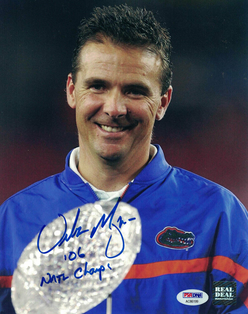 Urban Meyer Autographed/Signed Florida Gators 8x10 Photo Natl Champs PSA 26976 This is an 8x10 photo that was personally autographed by Urban Meyer with Natl Champs inscription. This photo includes a certificate of authenticity from Professional Sports Authentication (PSA/DNA) and Denver Autographs.