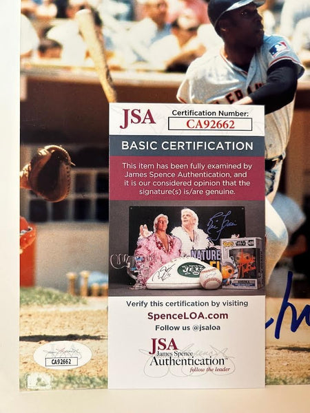 The product is an autographed 8x10 photo of baseball player Willie McCovey from the San Francisco Giants. The autograph has been authenticated by James Spence Authentication (JSA) confirming its authenticity. This original signed photo is a collectible item for fans of McCovey and the San Francisco Giants, making it a unique and valuable piece of memorabilia for sports memorabilia enthusiasts.