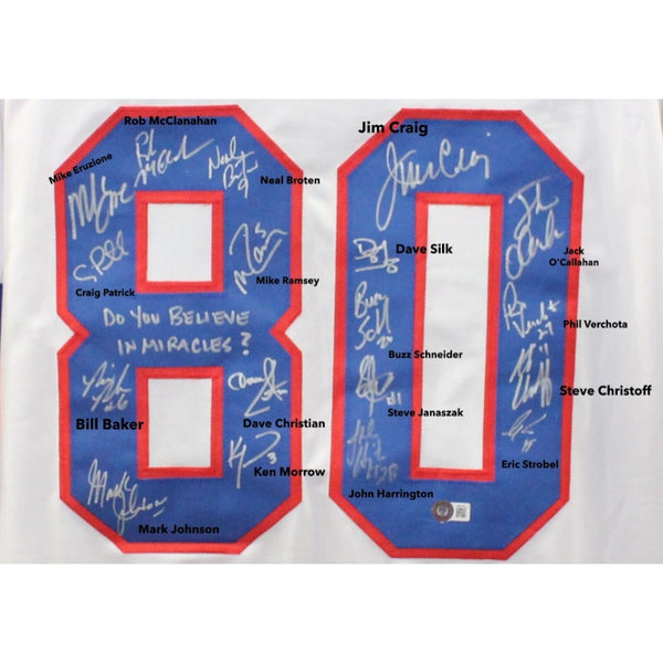 The number in the listing title is just an inventory sku for our records and is not the authentication number. The item pictured is a stock photo unless otherwise noted. This is a 1980 Team USA Miracle on Ice Hockey 1980 White Custom XL Jersey that was personally autographed by Mike Eruzione, Rob McClanahan, Neal Broten, Craig Patrick, Mike Ramsey, Bill Baker, Dave Christian, Mark Johnson, Ken Morrow, Jim Craig, Dave Silk, Jack O'Callahan, Buzz Schneider, Phil Verchota, Steve Janaszak, Steve Christoff, John Harrington, and Eric Strobel. Includes a certificate of authenticity from Beckett Authentication Services (BAS) and Denver Autographs.