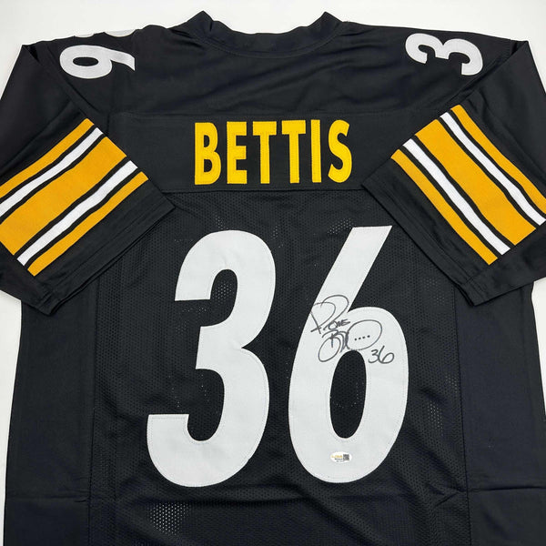 Autographed/Signed Jerome Bettis Pittsburgh Black Football Jersey JSA COA Jersey has no brand names or logos. This is a custom jersey and was not manufactured by or in any manner associated with any professional sports league or manufacturer. This custom jersey carries no professional sports league designation. The item is intended to be an autographed collectible. The custom jersey displays the name and number of the player. This item in no way is affiliated with or connected to any professional sports organization. Size is XL.