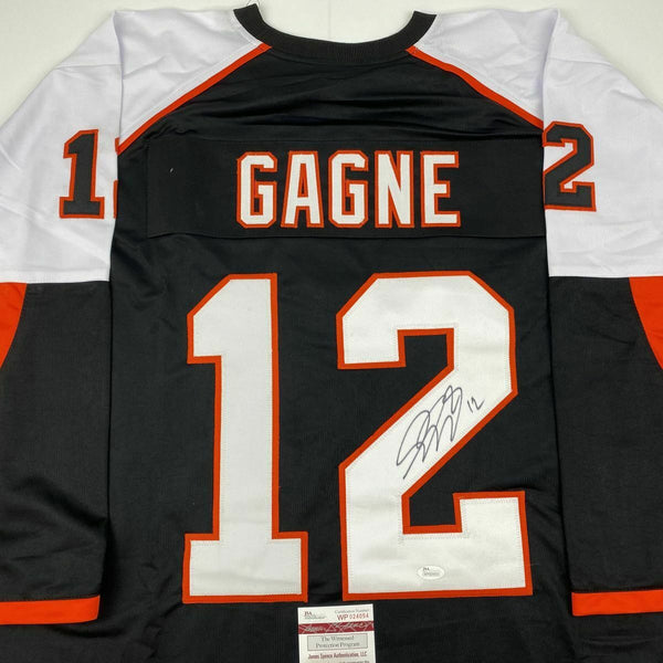 Autographed/Signed SIMON GAGNE Philadelphia Black Hockey Jersey JSA COA Auto This is a custom jersey and was not manufactured by or in any manner associated with any professional sports league or manufacturer. This custom jersey carries no professional sports league designation. The item is intended to be an autographed collectible. The custom jersey displays the name, number and authenticated signature of the player. This item in no way is affiliated with or connected to any professional sports organization. The autograph, as always is guaranteed to be authentic and has been certified as authentic by a third-party, trusted authenticator. Size is XL unless otherwise noted.