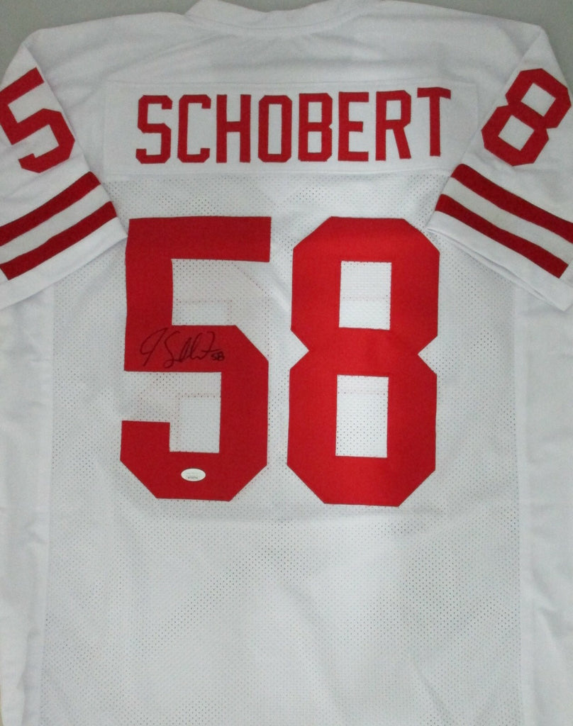 Custom Jersey hand signed by Former Wisconsin Badgers Linebacker JOE SCHOBERT. The signature is in Black Sharpie. This Item was signed at a public signing and would make a great addition to any Badgers or Browns collection! The jersey is size XL and all letters and numbers are sewn/stitched on. This item is guaranteed to be 100% authentic and will include a COA from JSA (James Spence Authentication) with matching serial numbers.
