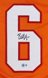 A Tampa Bay Custom Orange Jersey hand signed by Baker Mayfield. The item and signature are in excellent condition. Baker was drafted into the NFL in 2018 round 1. Baker was PFWA ALL-Rookie Team, PFWA Rookie of the Year (2018), a Heisman Trophy, Maxwell Award, Walter Camp Award and the Davey O'Brien Award winner. AUTHENTICATION: This item is accompanied by a Beckett Serial Numbered and Databased Hologram