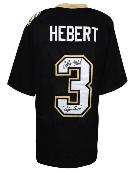 Bobby Hebert signed black custom football jersey with 'Cajun Cannon' inscription. Item comes with a Schwartz Sports Memorabilia tamper-proof numbered hologram and Certificate of Authenticity which can be verified online. Jersey is size XL.