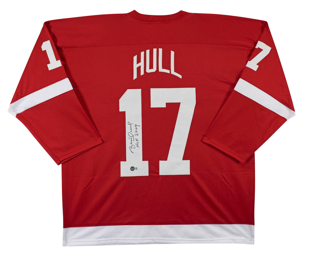 This Autographed Red Pro Style Jersey with the inscription of "HOF 2009" has been Personally Signed by Brett Hull of the Detroit Red Wings. This item is 100% Authentic to include a hologram by Beckett Authentication Services. This item will come with an affixed Beckett Authentication Services (BAS) authentication sticker, which includes a scannable QR code to verify authenticity. Please note that Beckett no longer provides serial-numbered COA cards, and the attached BAS sticker will serve as the complete authentication for this item. This is a BAS Witnessed Protection Program item which means a Beckett Authentication Service representative was present when this item was being signed. We have multiples of this same item. While the photographs are representative of this item, the size, placement and strength of the signature may vary. Each item is hand signed, therefore, each autograph is unique. This is a X-Large sized, non-branded, custom-stitched Jersey.