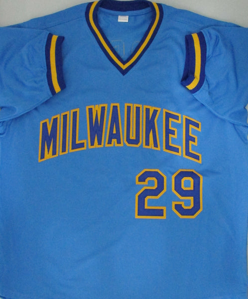 A hand signed custom replica jersey of former Milwaukee Brewers Pitcher CHRIS BOSIO. The signature is in Silver paint pen. The jersey is size XL and has all letters and numbers sewn on. This item was signed at a private signing with us. This would make a great addition to any Brewers collection! This item is guaranteed to be 100% authentic and will include a store COA with matching serial numbered holograms.