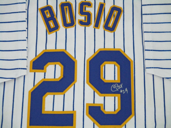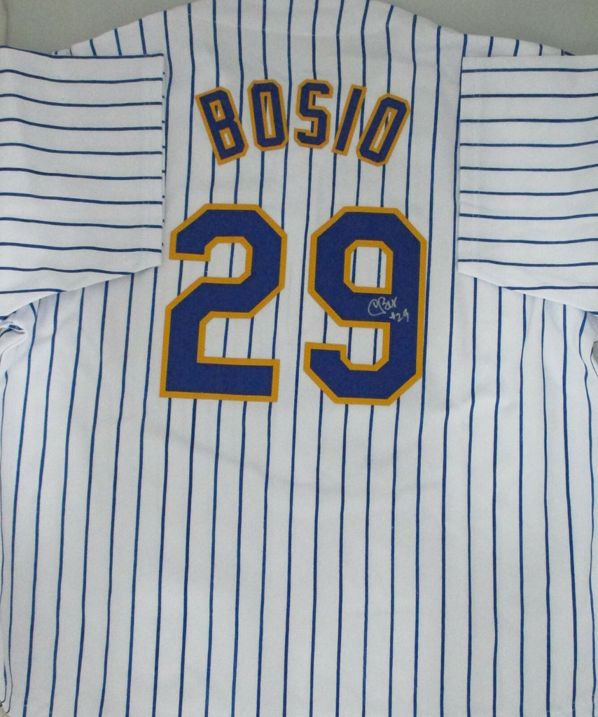 A hand signed custom replica jersey of former Milwaukee Brewers Pitcher CHRIS BOSIO. The signature is in Silver paint pen. The jersey is size XL and has all letters and numbers sewn on. This item was signed at a private signing with us. This would make a great addition to any Brewers collection! This item is guaranteed to be 100% authentic and will include a store COA with matching serial numbered holograms.