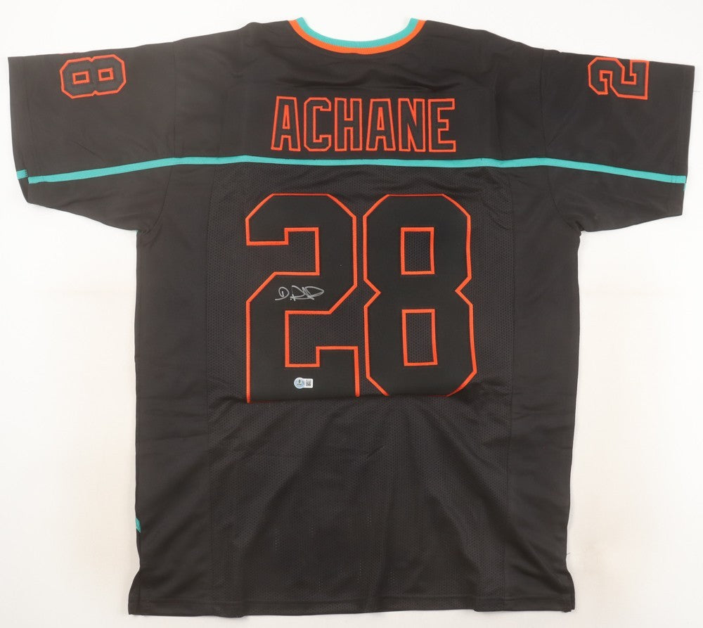 Custom on-field style jersey. Everything is sewn on, size adult XL. Hand-signed by De'Von Achane.The autograph includes an official Beckett Authentication Services serially numbered hologram and QR Code card for authenticity purposes. The signing of this item was witnessed by Beckett.Authentication: Beckett Hologram with QR Code card