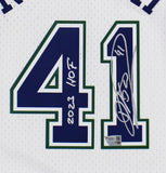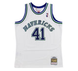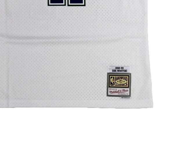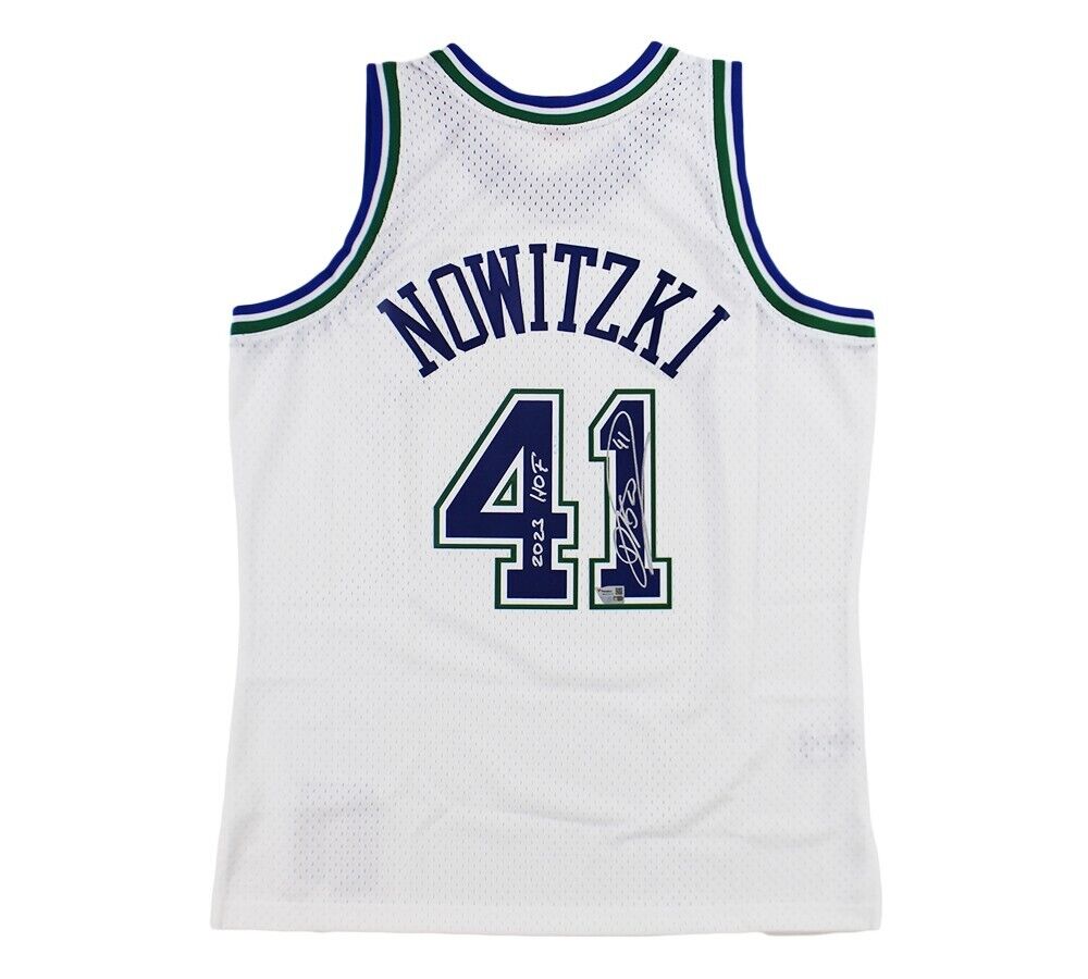 A Dallas Mavericks Mitchell & Ness Swingman '98-99 White NBA Jersey hand signed by Dirk Nowitzki. The item and signature are in excellent condition. In Addition to signing his name, Dirk also inscribed "HOF 23" on the item. Dirk has had an incredible career. Some of his highlights have been; he is an NBA Finals MVP, NBA Finals Champion and 14x NBA All-Star. AUTHENTICATION: The item is accompanied by a Fanatics Authentic Serial Numbered and Databased hologram