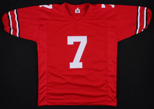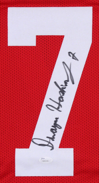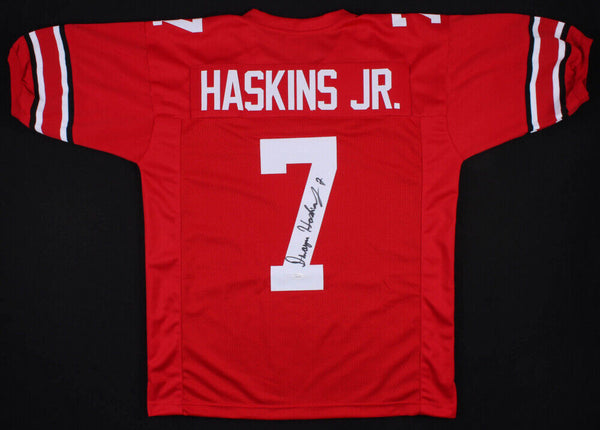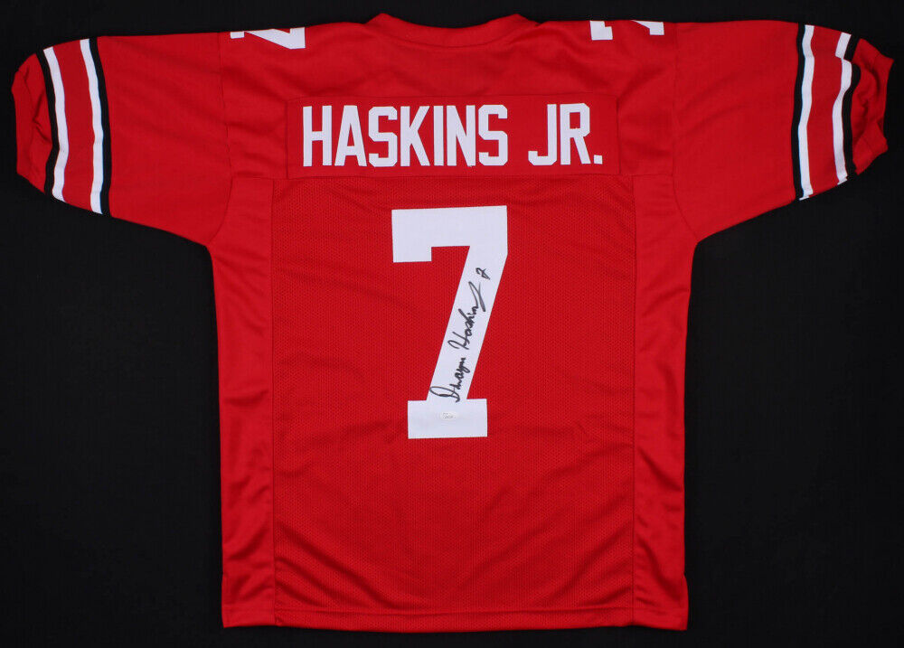 Custom on-field style jersey. Everything is sewn on, size XL. Hand-signed in black felt-tip pen by Dwayne Haskins.Haskins died on April 9, 2022, after he was struck by a dump truck while attempting to cross I-595 near Fort Lauderdale, Florida on foot. He was in Florida to train with several of his Pittsburgh Steelers teammates. The autograph(s) includes an official James Spence Authentication (JSA) "Signature Debut" hologram and COA. "Signature Debut" is the autographed memorabilia equivalent to a rookie card. The JSA definition of a "Signature Debut" is as follows: "Any item that is autographed and received by JSA prior to the last game of the signer's official rookie season.Authentication: JSA Signature Debut COA