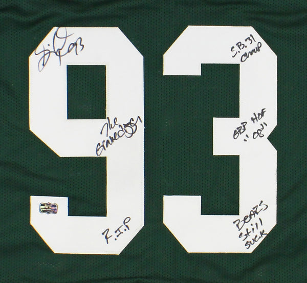 A Green Bay Custom Green Jersey hand signed by Gilbert Brown. The item and signature are in excellent condition. In addition to signing his name, Gilbert also inscribed "The Gravedigger, R.I.P, S.B 31 Champ, GBP HOF'08, Bears Still Suck" on the item. Gilbert is a former football nose tackle. He spent his career with the Green Bay Packers & is a XXXI Super Bowl Champ. AUTHENTICATION: Your item has been tagged with a SmarTag powered by Prova Technology, which gives you digital access to your items authentication records, including a proof picture from the signing.