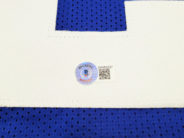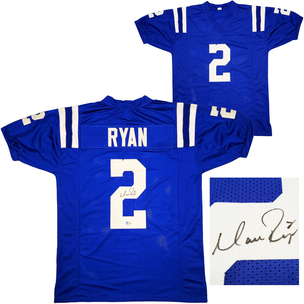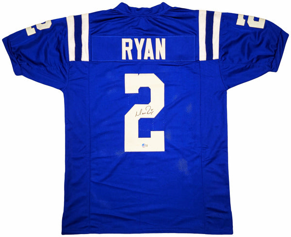 This is a Blue Jersey that has been hand signed by Matt Ryan. This is a custom jersey with no name brand. The approximate size is XL. It has nice sewn in name and numbers. This item has been certified authentic by Beckett Authentication (BAS) and comes with their tamper-proof QR Code sticker that can be verified on the Beckett-authentication.com.