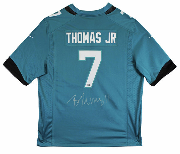 This Autographed Teal Nike Game Jersey has been Personally Signed by Brian Thomas Jr. of the Jacksonville Jaguars. This item is 100% Authentic to includes a numbered hologram by Fanatics. We conducted an autograph signing with Brian Thomas Jr. where multiples of the same item were signed. While the photographs are representative of this item, the size, placement and strength of the signature may vary. Each item is hand signed, therefore, each autograph is unique. This item can be verified through Fanatics. This is a X-Large sized Jersey.