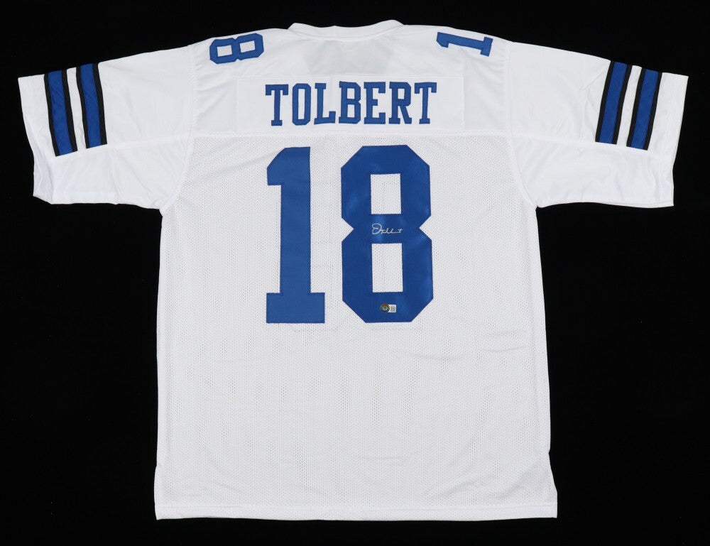 Custom on-field style jersey. Everything is sewn on, size XL. Hand-signed by Jalen Tolbert.The lot / autograph(s) includes an official Beckett Authentication Services serially numbered scannable hologram and QR Code card for authenticity purposes.Authentication: Beckett Scannable Hologram with QR Code card