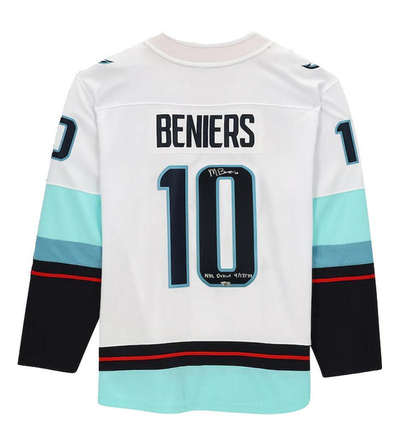 This seattle kraken inaugural season patch fanatics branded jersey has been personally hand-signed by matt beniers with the added inscription "nhl debut 4/12/22." it is officially licensed by the national hockey league and comes with an individually numbered, tamper-evident hologram from fanatics authentic. to ensure authenticity, the hologram can be reviewed online. this process helps to ensure that the product purchased is authentic and eliminates any possibility of duplication or fraud.