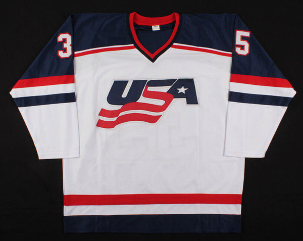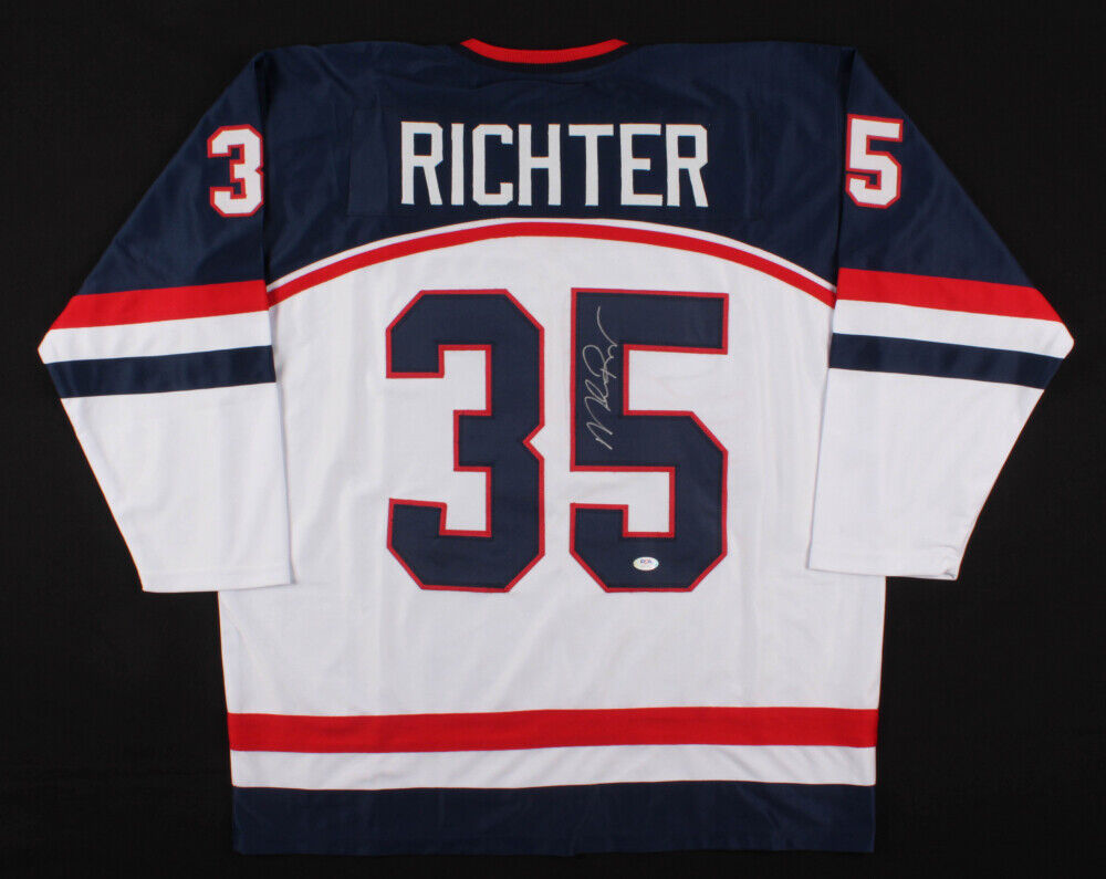 Custom on-ice style jersey. Everything sewn on, size XL. Hand-signed in silver paint pen by Mike Richter. Please see images for details regarding the condition of the jersey. The lot / autograph(s) includes an official PSA/DNA hologram and matching COA for authenticity purposes.Authentication: PSA COA