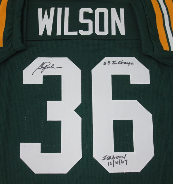GREEN BAY PACKERS CUSTOM JERSEY of former PACKERS RUNNING BACK BEN WILSON #36. This jersey is signed with Black sharpie and includes the inscription "SB II Champs and Ice Bowl 12/31/67". This jersey is size XL and has all letters and numbers sewn/stitched on. This item was signed at a public signing with us and would make a great addition to any Packers collection. This item is guaranteed to be 100% authentic and will include a COA with maCthing tamper proof holograms.