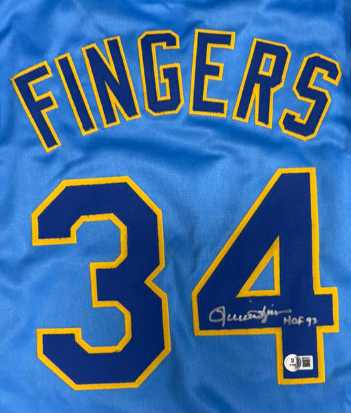 custom replica jersey of Milwaukee Brewers Hall of Famer ROLLIE FINGERS. This jersey is signed with Silver paint pen and includes the inscription "HOF '92". This jersey is size XL has all letters and numbers sewn in. This item was signed at a private signing with us and would make a great addition to any Brewers collection. This item is guaranteed to be 100% authentic and will include a COA from Beckett Authentication with matching serial numbers.