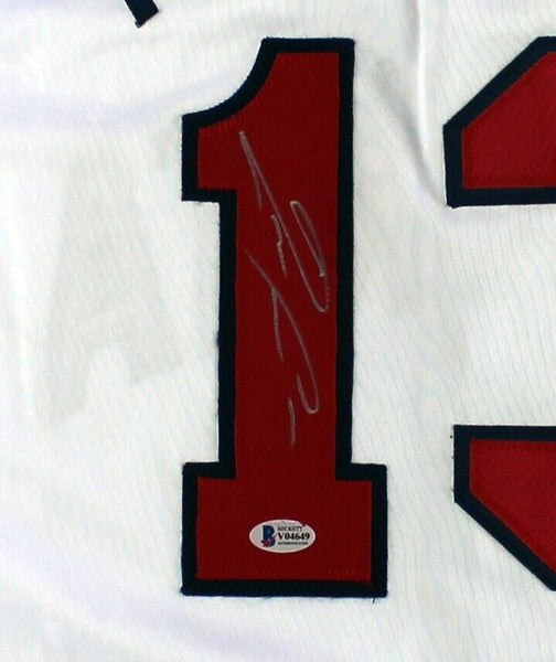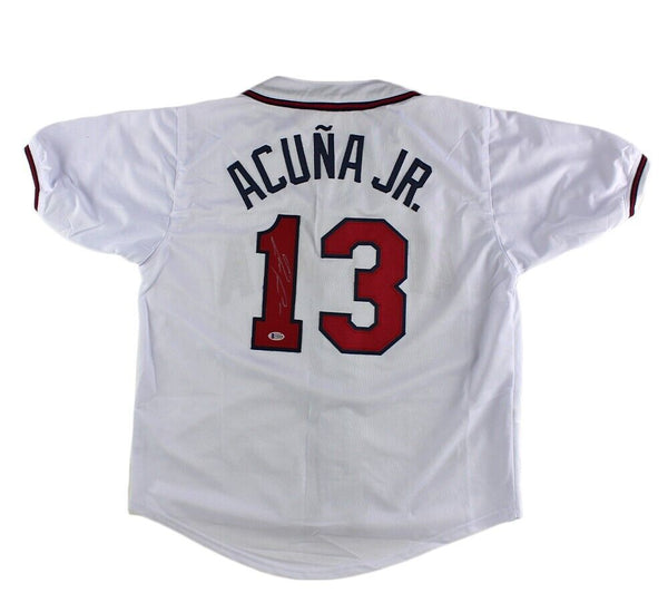An Atlanta Custom White Jersey hand signed by Ronald Acuna. The item and signature are in excellent condition. Ronald is a professional baseball player who plays outfield. He won the National League Rookie of the Year award and the Silver Slugger award in 2018. AUTHENTICATION: The item is accompanied by a Beckett Certificate of Authenticity - Beckett Serial Numbered & Databased Holograms