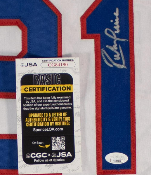 Custom on-field style jersey. Everything is sewn on, size XL. Hand-signed in silver paint pen by Ruben Sierra. The lot / autograph(s) includes an official James Spence Authentication (JSA) hologram and matching COA for authenticity purposes. The signing of this item was witnessed by JSA.Authentication: JSA COA