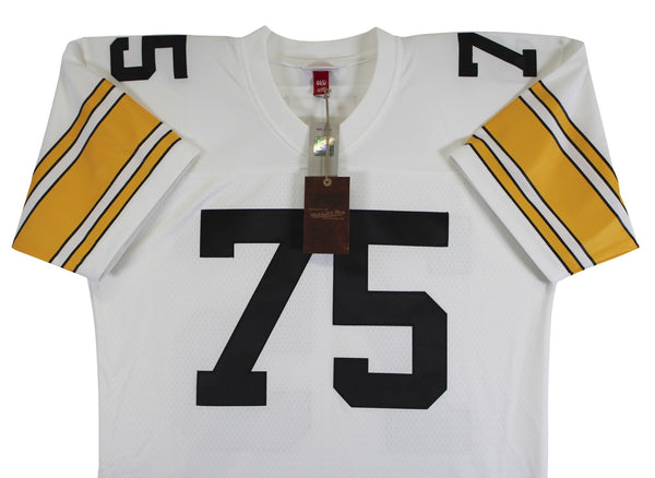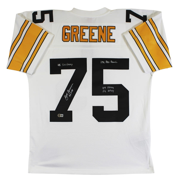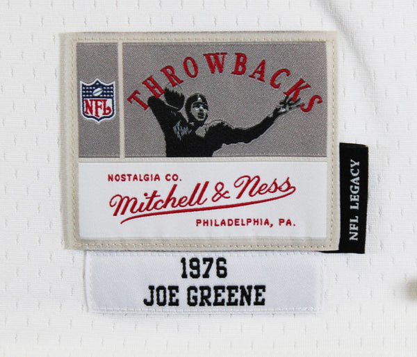 This Autographed White Mitchell & Ness 1976 Throwback Jersey with the inscription of "HOF 87, 4x SB Champ, 10x Pro Bowl, 69 DROY, 2x DPOY" has been Personally Signed by Joe Greene of the Pittsburgh Steelers. This item is 100% Authentic to include a hologram by Beckett Authentication Services. This item will come with an affixed Beckett Authentication Services (BAS) authentication sticker, which includes a scannable QR code to verify authenticity. Please note that Beckett no longer provides serial-numbered COA cards, and the attached BAS sticker will serve as the complete authentication for this item. This is a BAS Witnessed Protection Program item which means a Beckett Authentication Service representative was present when this item was being signed. The authenticity can be verified on Beckett Authentication Services website. This is a Large sized Jersey. There is a small stain on the bottom of the front side of this jersey. Please refer to pictures for item's condition prior to purchase.