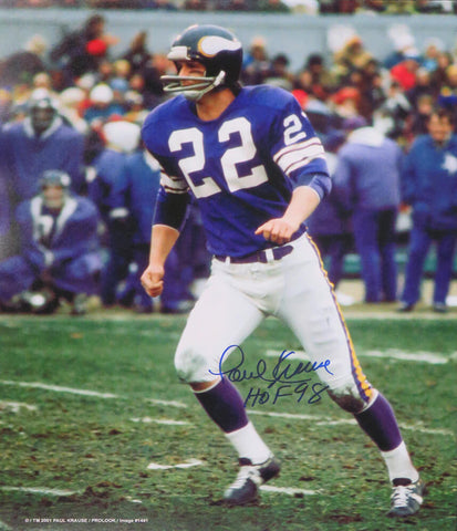 Paul Krause Signed Minnesota Vikings Action 16x20 Photo w/HOF'98 (SCHWARTZ COA)
